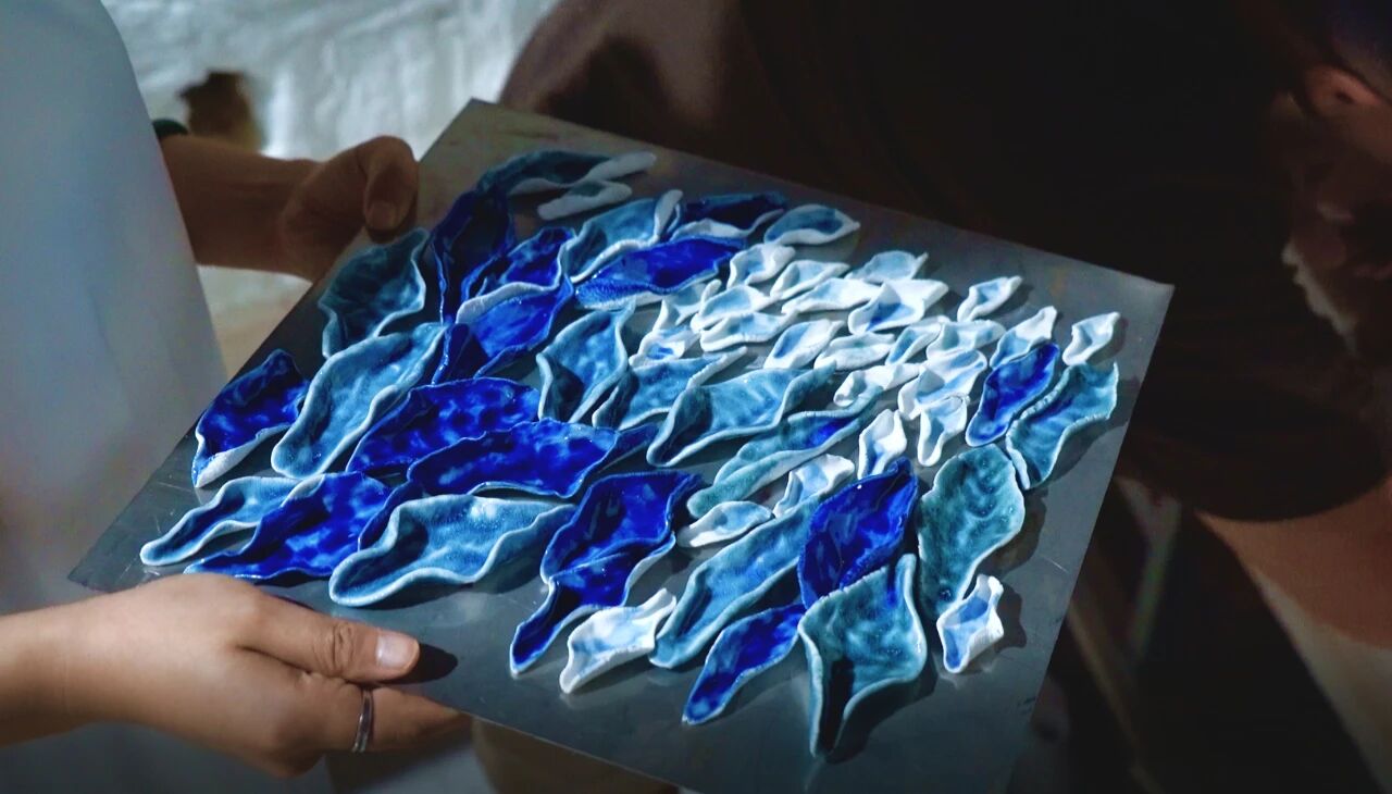該工藝既保留了每片瓷獨(dú)特的手工質(zhì)感與肌理,又通過精密的結(jié)構(gòu)設(shè)計(jì),確保了整體形態(tài)的連貫與結(jié)構(gòu)的穩(wěn)固。從而使“青暉”在宏觀上呈現(xiàn)渾然一體的完整氣韻,在微觀處富含細(xì)膩生動(dòng)的陶瓷語言,達(dá)成整體與局部的和諧統(tǒng)一。